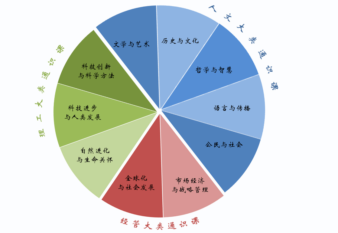 亲爱的2012级同学: 为帮助您了解上海大学通识教育理念和通识教育课程体系,方便您选择符合您所属大类指导性教学计划及自己兴趣、发展需要的课程,我们准备了有关资料供您参考。 1. 通识教育理念 我校旨在"培养全面发展具有创新精神的一代新人"。2011年秋季学期起,学校开始全面实施通识教育。通识教育是一种教育理念,是在高等教育阶段面向全体学生进行的基础性的人文和科学知识的传授、个性品质的训练、公民意识的陶冶,以及不直接服务于专业教育的人所共需的一些实际能力的培养。要求学生广泛学习不同学科领域的知识和研究方法,促进不同学科的融合,强化人文精神和科学精神教育。 2. 我校通识教育课程体系 从2011~2012学年开始,我校实行大类招生,并向2011级学生集中开设出一批通识课和新生研讨课。它们和原有的公共基础课、专业课等构成了完整的通识教育体系。 本科生大类招生本科生培养制度的实施,不仅是管理体制的变化,更重要的是教育思想和教育观念等深层次的转变。其主导原则是突破单纯的"专业视域"和单纯的"知识视域",帮助学生形成基本的人文修养、前瞻性的科学思维和历史的理性眼光。为此,凝练出大一和后三年分库的涵盖人文社科、经管和理工三大通识课课程领域,并形成十个通识课课程模块(如下图)的300多门通识课。它们各具目标,共同为实现上述通识教育总体目标服务。