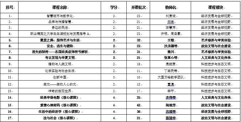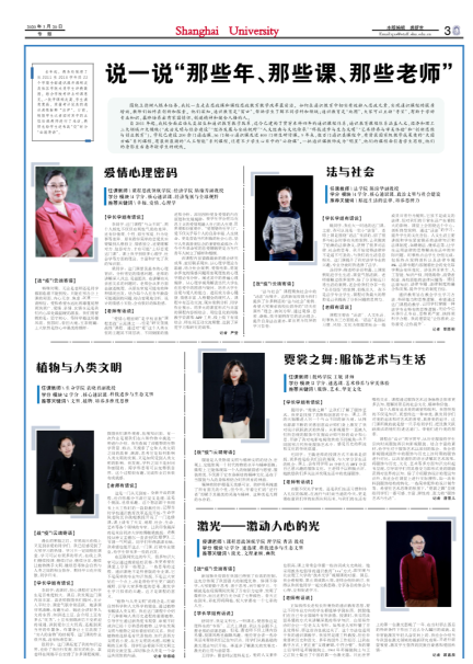 作为上海高校课程思政领航高校,上海大学紧紧围绕立德树人根本任务,努力实现通识教育“四个注重”,即注重价值观引领,注重人文、理工、经管和艺术等学科交叉,注重学生学术训练,注重学生经典阅读。学校已在人才培养方案中要求本科生四年内做到“三个全覆盖”,即三大领域“核心课程”选修学分全覆盖,“创新创业”课程学分全覆盖,“美育”课程学分全覆盖。上海大学率先开发“大国方略系列”课程,获评国家级教学成果奖。学校开发的“人工智能系列”尔雅慕课得到越来越多国内高校学生修读,线下课程也因内容新、学科融、文理通得到本校学生欢迎,同时得到社会媒体广泛关注。 一批长期以来默默耕耘在通识教育战线的名师优课正在涌现。近期,教务处梳理了全面实施通识教育以来8年23个学期开课数据、18个学期大类学生评教数据,公布了17门开课频次高、学生评教好、专家考评成绩优良的通选课和核心通识课(按“三大类”和“核心课程”区分)。教务处还邀请设计师为“那些年那些课那些老师”精心设计了荣誉勋章和证书。