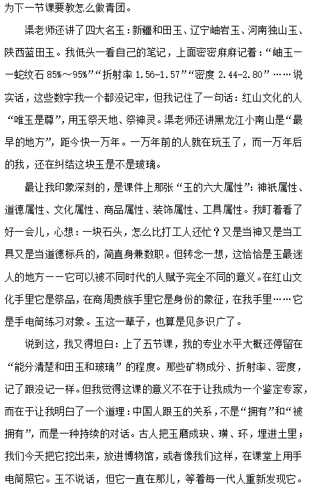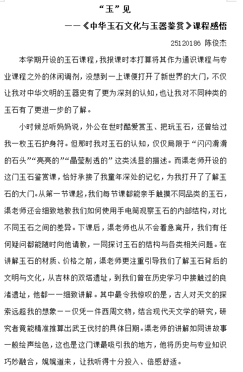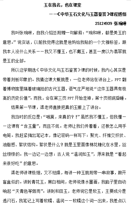 课程名称: 中华玉石文化与玉器鉴赏 英文名称: Chinese Jade Culture and Jade Ware Appreciation 课程编号: YBK0400004 课程学分: 2 所属模块: 艺术修养与审美体验 开课学院: 文学院 主讲教师:渠嵩烽 课程简介:课程系统梳理分析了中华玉石从巫玉传统、史玉传统到德玉传统的演进脉络,以及玉石神祇属性、道德属性、文化属性、商品属性的古今流变历程,对中国古代各个历史时期代表性玉器的形制和品类(物理形态)及其背后的社会文化功能(观念形态)作了具体介绍,并以此探寻玉石与中华文明起源、发展和演进的关系,以及玉石在中国文字、文学和文化生成、传播方面的作用和意义。 和田玉是中国古代用玉传统长期筛选的历史结果,是国人自古迄今对“玉”概念的代表性认知,是中华玉文化的主要载体和儒家道德的重要指代,而自古以和田玉运输、交流形成的玉石之路更是中国统一多民族国家形成和发展历程的一个缩影。课程还结合实物赏鉴的直观方式,重点介绍了“国玉”和田玉的产区分布、品种类别、鉴定方法以及制作工艺等,并附带介绍了蓝田玉、岫岩玉、独山玉等历史名玉,以及翡翠、玛瑙、绿松石等当前常见玉石品种,培养学生上述玉石品种鉴赏和辨识的基本方法。