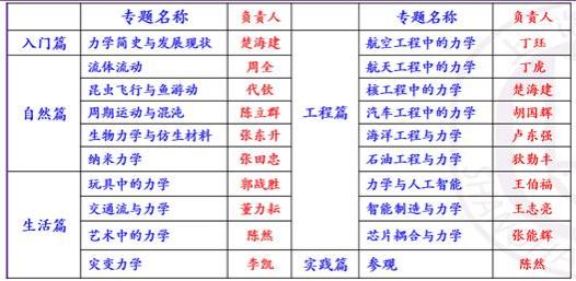课程简介: 力学是物理、材料、机械、土木等众多学科的重要理论基础,在航空航天、能源交通、先进材料设计与制造等领域有着十分广泛的应用。本课程的教学目标为:普及力学基本知识和方法,结合工程实践,培养学生的科学与工程素养;强调学科交叉,拓展学术视野,培养学生以“大工科”的思维分析研究实际问题的能力;弘扬力学科学家精神,厚植家国情怀,培养责任担当意识。课程主要内容有: 表1 课程的主要内容
