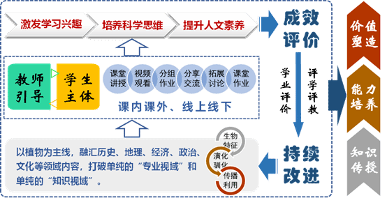 课程名称:植物与人类文明 课程所属模块:科技进步与生态文明 课程负责人:袁晓君 课程简介: “植物与人类文明”为生命科学学院开设的一门核心通识课,面向我校各大类各年级本科生全年开设。2013年开课至今,累计授课超四千人次,获得专家和学生的一致好评。课程全面介绍影响人类文明进程的主要植物,让学生系统了解它们的基本特征、演化驯化历史,以及传播历程;课程积极打破单纯的“专业视域”和“知识视域”,启发引导学生进行跨学科的思考,从多维度审视植物与人类之间的关系;通过学习交流,激发学生内在学习兴趣,学会自己发现和探索植物和人类文明之间的关系,提升科学思维能力和人文素养,体会不同文明的交流互鉴。