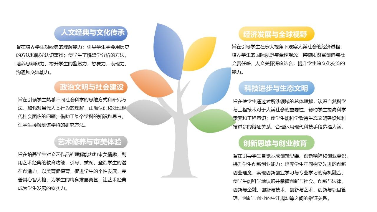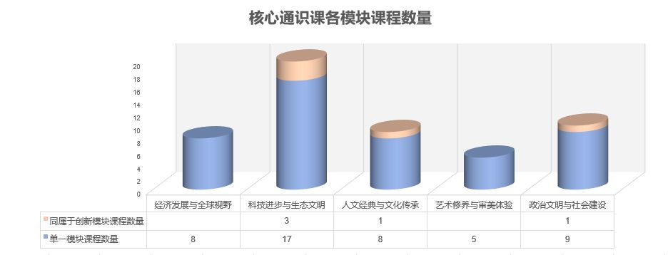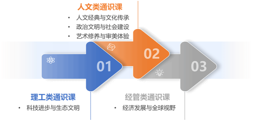 根据学校大类招生要求,学校凝练出人文社科、经济管理和理学工学三大通识课程领域。2016-2017学年秋季学期起,我校在原有五个模块的通识教育课程体系中新增“创新思维与创业教育”模块。新入学的本科生须根据各学院/专业在此三大领域的六个模块中规定的通识课程学分要求,选择相应模块中的课程,修满规定学分。